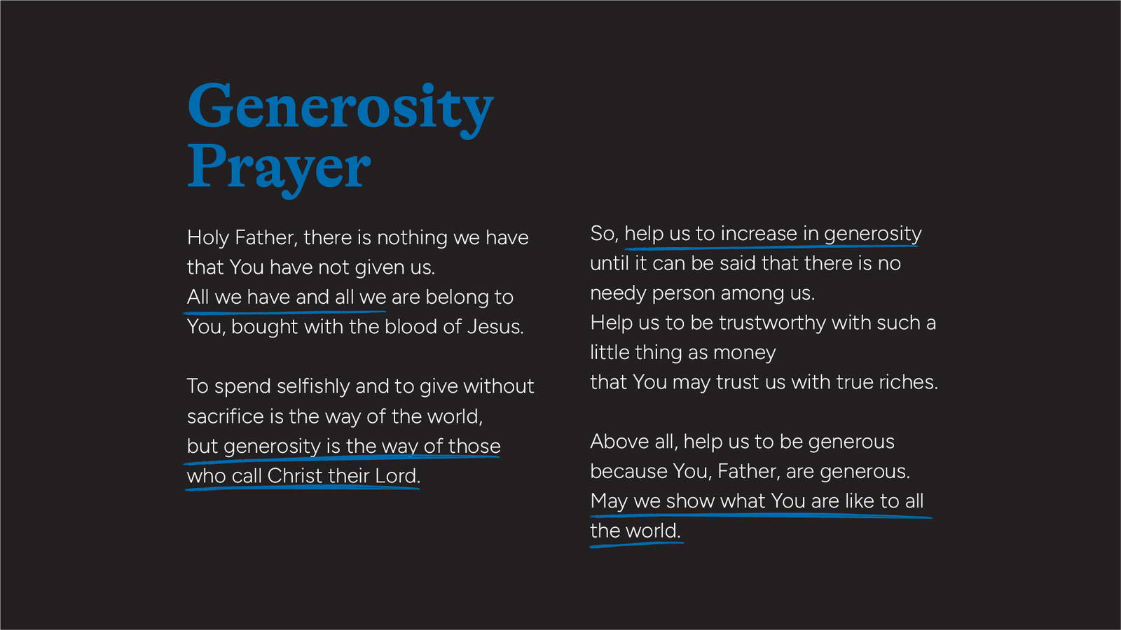 We desire to be generous, because generosity is the way of those who call Christ their Lord. We believe generosity is a distinct trait of believers in Christ, and Scripture points to this! Our hope at TVC is that through our generous giving, we show what Christ is like to all the world.
